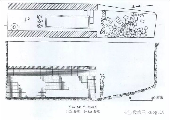 1.长方形墓 1座(M1)。方向184°,由墓道和墓室两部分组成,通长6.62米(图二)。墓道位于南侧,口略宽于底,底部南高北低呈缓坡状,以单层砖铺砌。口部长2.64米,宽1.1—1.5米;底部长2.64米,宽1.08—1.24米,深1.9—2.6米。墓室位于北部,为长方形券顶式,长3.98米,宽0.98米,高1.42米。南北两端无砖,北端以土圹为壁,南端与墓道相通。东西两壁以6层丁砖侧砌而成,其上渐内收为券顶,券顶外部的砖缝以陶片塞实。墓室底有平砌的铺地砖一层。墓室南口外有顺砖平砌而成的封门一重,其中部有宽约0.2米的立缝。墓室南部有长方形木棺一具,长2米,宽0.58米,残高0.34米,棺内未见人骨。随葬品位于墓室北部,共5件,均为陶罐。