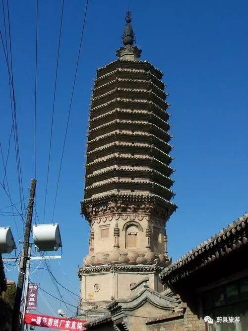 5、南安寺塔:位于蔚县城南西侧,是一座始建于北魏佛教盛行时期,重修于辽代的8面13级实心密檐砖塔,塔高28米,塔基为石条叠砌面成,塔身置于莲花座之上。塔身第一层较高,各隅皆有塔柱,四周相间设拱形隔扇门与小窗,顶部雕盘龙,盘龙之上又有砖斗拱。二层以上变低。各层都悬有铁马,微风吹过,叮咚有声。