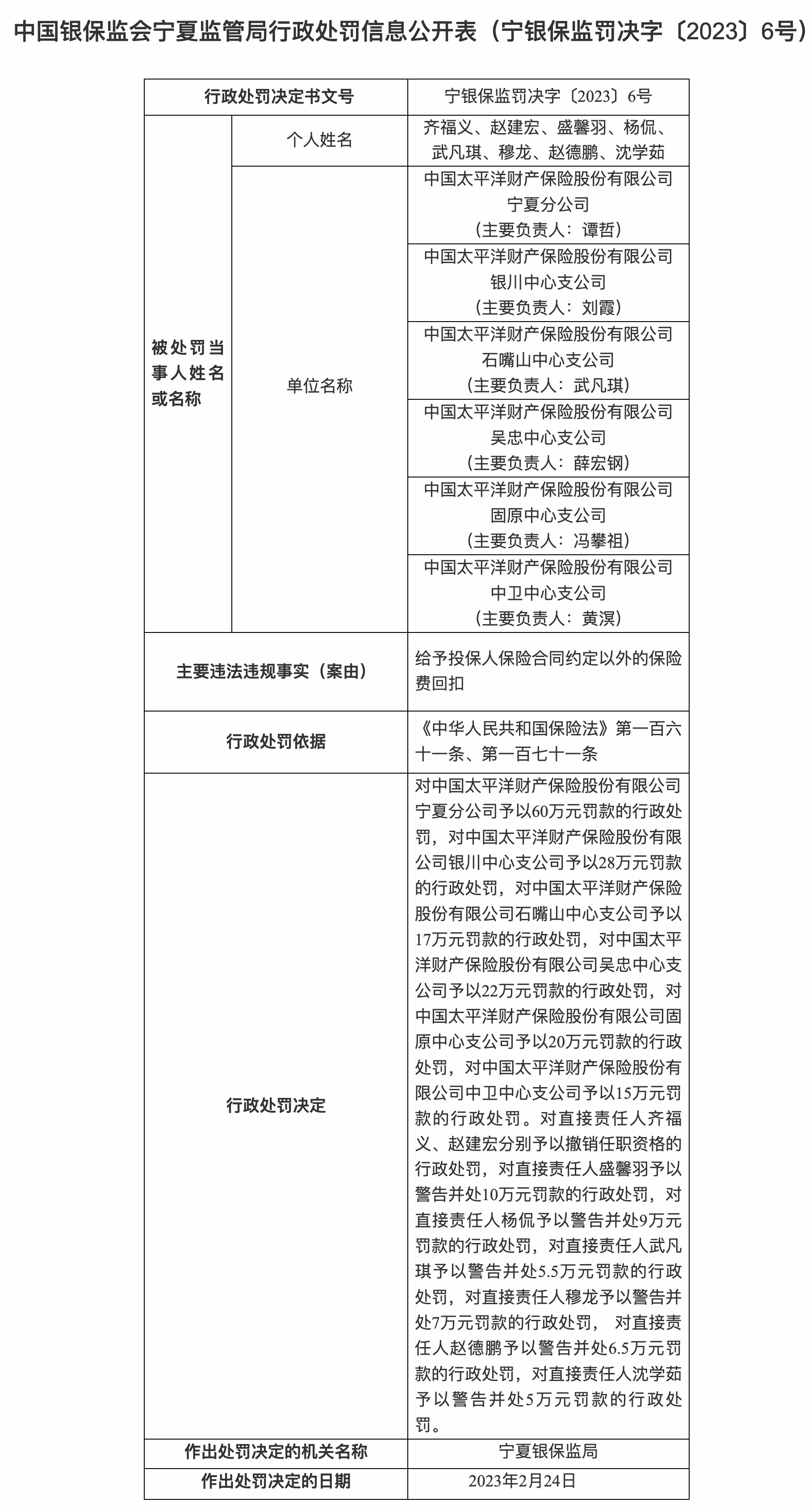3月5日消息,中国银保监会宁夏监管局行政处罚信息公开表显示,因给予投保人保险合同约定以外的保险费回扣,中国太平洋财产保险股份有限公司宁夏分公司及银川、石嘴山、吴忠、固原、中卫5家支公司合计被罚162万元。此外,宁夏银保监局对2名直接责任人予以撤销任职资格的行政处罚;对6名直接责任人予以警告并罚款的行政处罚,合计罚款43万元。