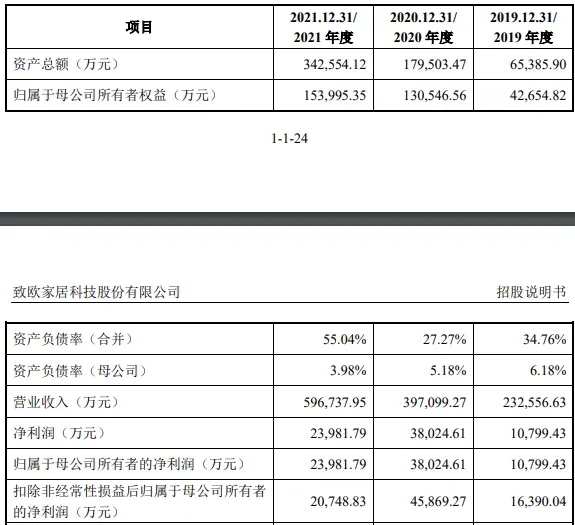 2018-2021年,致欧科技营业收入分别为159,467.60万元、232,556.63万元、397,099.27万元和596,737.95万元,净利润分别为4,164.71万元、10,799.43万元、38,024.61万元和23,981.79万元,归属于母公司所有者的净利润分别为4,063.86万元、10,799.43万元、38,024.61万元和23,981.79万元,扣除非经常性损益后归属于母公司股东净利润分别为7,924.05万元、16,390.04万元、45,869.27万元和20,748.83万元,经营活动产生的现金流量净额分别为-3,282.11万元、8,899.60万元、-20,739.27 万元和26,492.11万元。